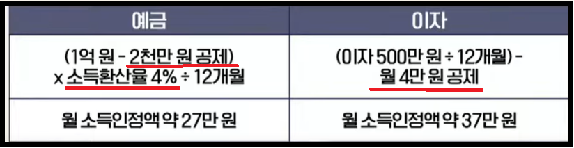 예금에서 2천만 원 공제하고, 예금에서 소득으로 환산되는 부분은 4% 이므로, 8천만 원 X4%= 320만 원. 320만 원을 12개월로 나누면 27만 원입니다.