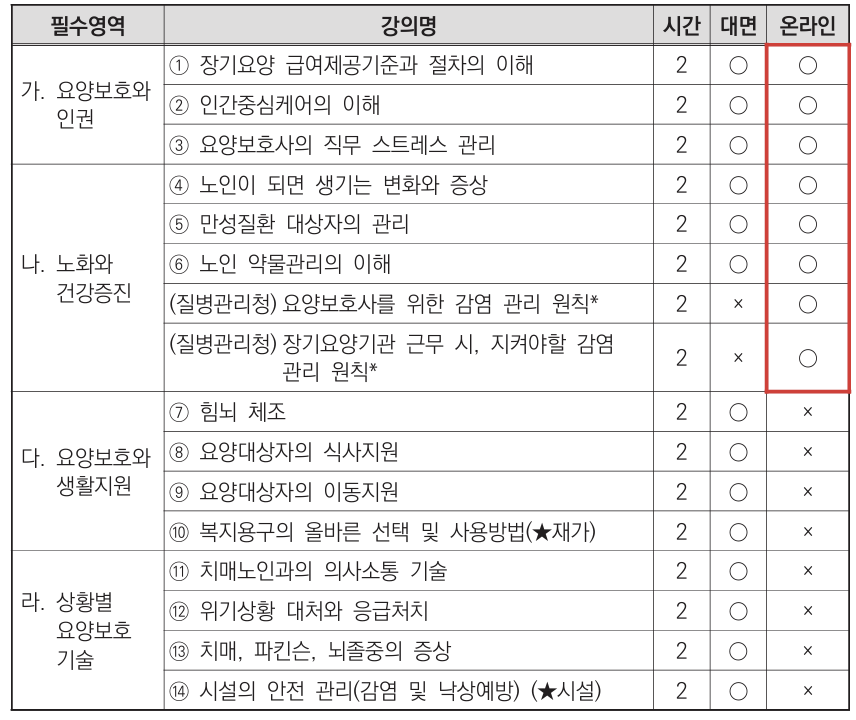 대면교육을 통한 이수는 영역별 ( 요양보호와 인권, 노화와 건강증진, 요양보호와 생활지원, 상황별 요양보호 기술 )로 각 2시간 이상 이수해야 하고, 온라인교육을 통한 이수는 2개 필수영역만 가능하고, 나머지 2개 영역 ( 요양보호와 생활지원, 상황별 요양보호 기술)은 대면 교육으로 이수해야 합니다.