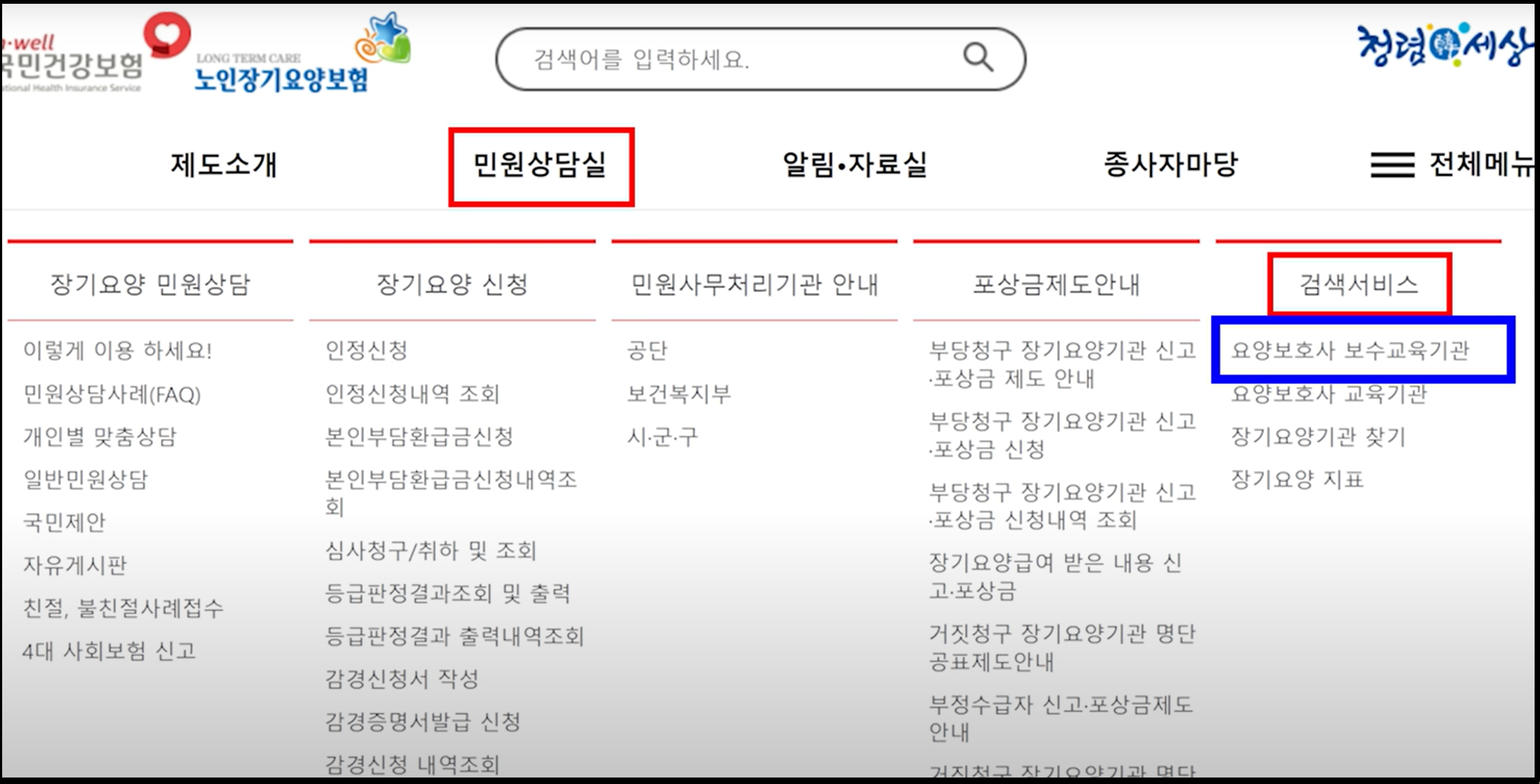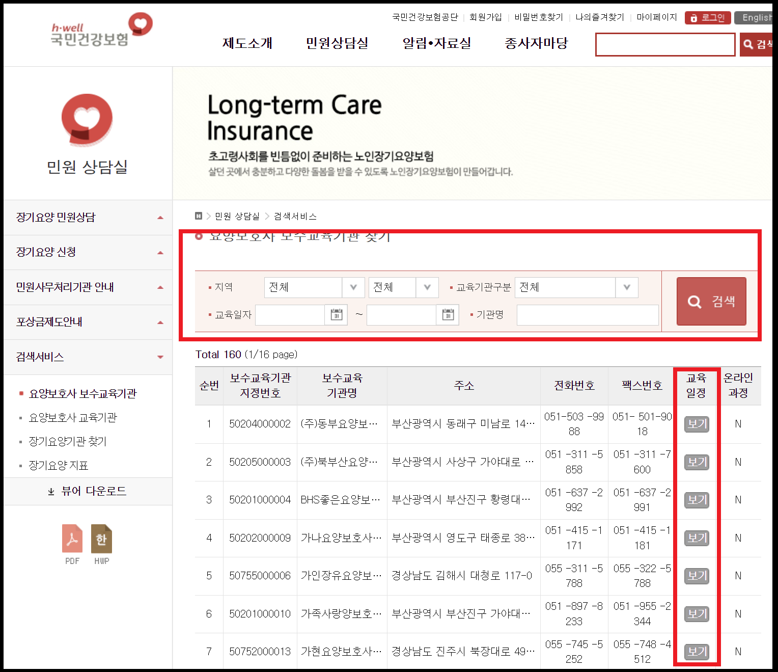 교육대상자는 노인장기요양보험 홈페이지를 통해서 민원상담실 >> 검색서비스 >> 요양보호사 보수교육기관 클릭하기 >> 본인의 거주지역에 맞는 보수교육기관 찾기 >> 교육일정보기 클릭합니다.