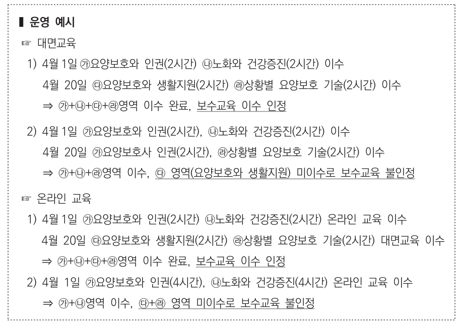 온라인 교육 수강자는 온라인 수강종료일부터 당해연도 60일 이내 대면교육( 다, 라 영역 각 2시간 이상) 수강을 완료해야 보수교육 이수자로 인정함을 유의하시기 바랍니다.